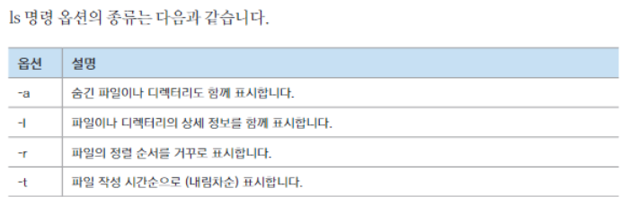 ls : 현재 디렉터리에 어떤 파일이나 다른 디렉터리가 있는지 확인할 때