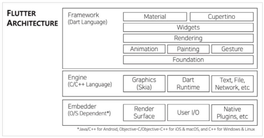 특히 Flutter Embedder는 특정 운영체제와 하드웨어에서 최적의 성능을 제공할 수 있도록, 운영체제에 특화된 언어를 사용한다.