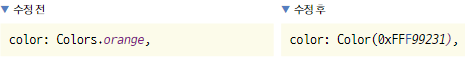 Flutter에서 헥스 코드를 색상으로 사용하려면, Colors 대신 Color 라는 클래스를 사용해야 한다.
