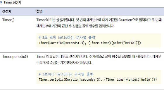 Timer는 특정 시간이 지난 후에, 한번 또는 지속적으로 함수를 실행한다. dart:async 에 정의되어 있다.