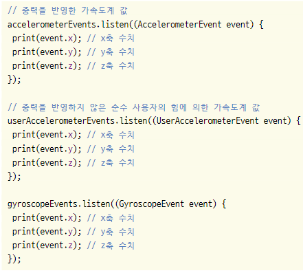 sensor_plus 패키지를 사용하면, 핸드폰의 가속도계와 자이로스코프 센서를 간단하게 사용할 수 있다.