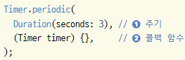 이번에는 Timer.periodic()을 사용해서 주기적으로 콜백 함수를 실행한다. Timer.periodic()은 파라미터 2개를 입력받는다.