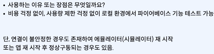 Firebase의 다양한 서비스를 구글 클라우드에서 돌리는 것이 아니라, 사용자의 로컬 컴퓨터 자체에서 돌리는 것을 말한다.
